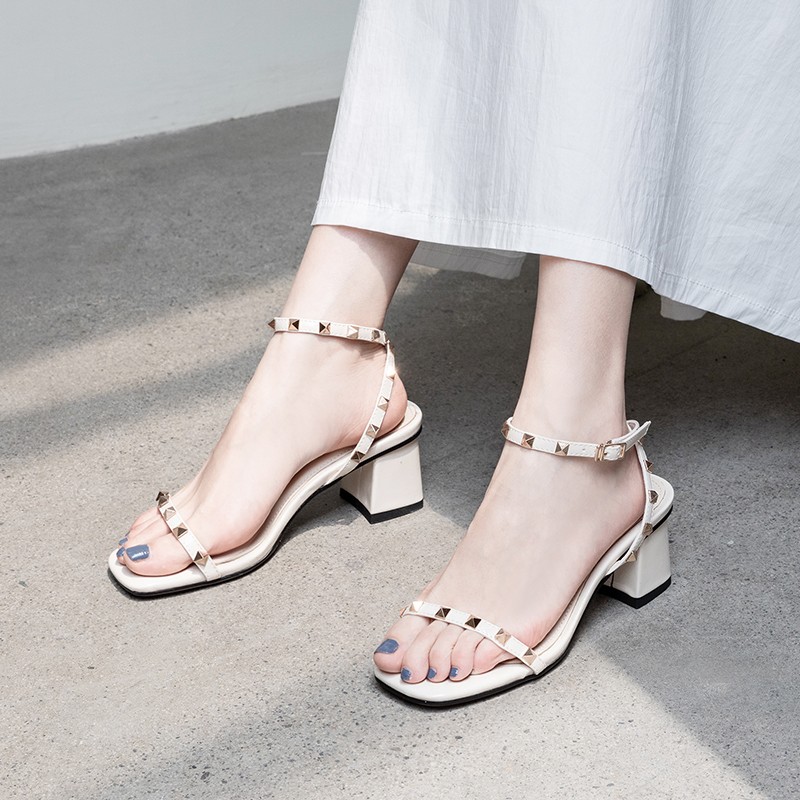 凉鞋女2019夏季新款粗跟高跟鞋网红仙女铆钉一字带中跟大小码女鞋